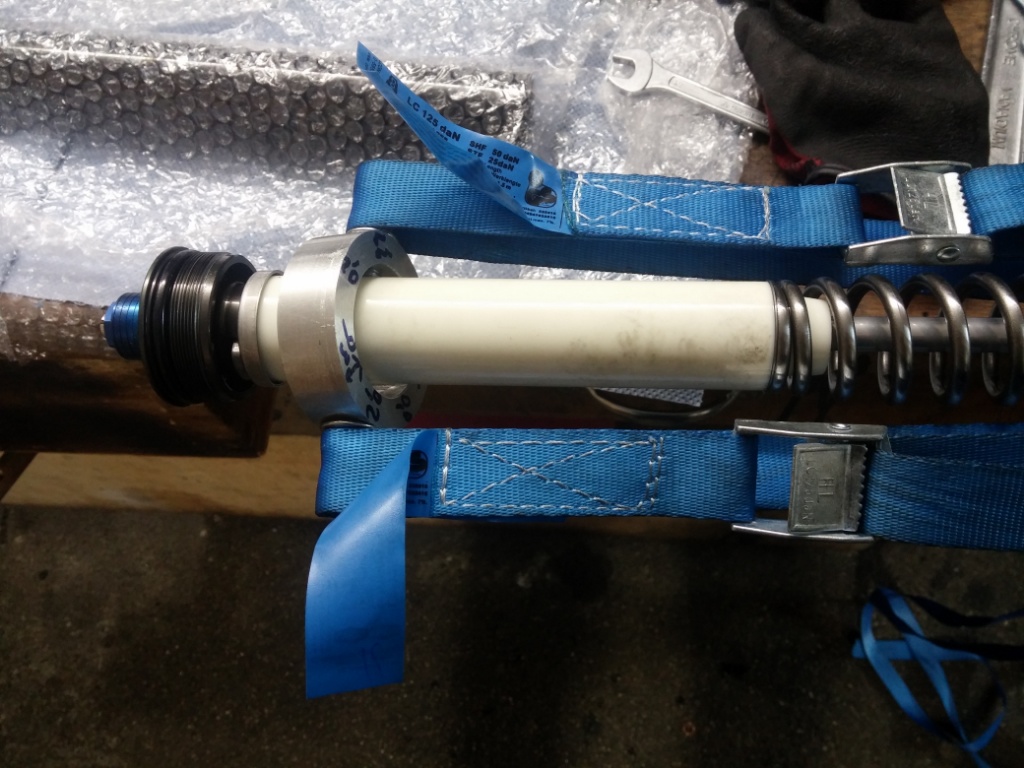 Nun zwei Spanngurte verwenden: Den einen über Gewindestange 1 unten durch die Achsaufnahme und wieder nach oben zur Ratsche, den anderen Spanngurt genauso, bloß unten durch das Loch der Bremssattelaufnahme. Das Aussenrohr schütze ich mit einem Lappen vor den Ratschen der Spanngurte. Die Gurte spannen und damit die Vorspannhülse nach unten ziehen, während der Stopfen nach oben gezogen werden kann. Es kommt die Verbindund des Dämpfers und des Stopfens zum Vorschein. Die Schubstange des Dämpfers ist in den Stopfen geschraubt und mit einer Kontermutter gesichert. Alternativ einen (sehr kräftigen) Helfer zum zusammen stauchen verwenden.