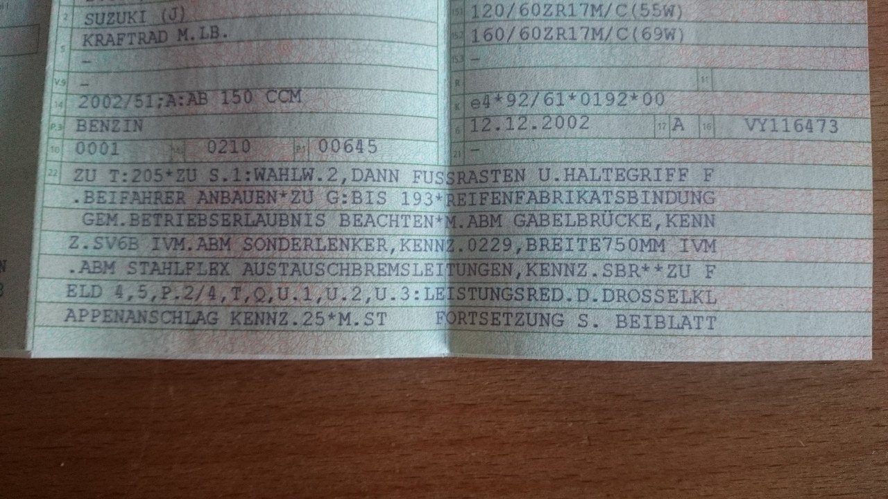 Die viel wichtigere Frage ist, die jetzigen Stahlflex sind eingetragen sowie der Stummel auch, da ich jetzt aber nicht genau durch meinen Fahrzeugschein durchblicke um zu Schauen ob die Stahlflex separat eingetragen sind um diese auch mit Stummel zu fahren (will ja keinen ärger mit dem TÜV) hänge ich euch einfach mal meinen Fahrzeugschein an. (Ja ihr seht richtig, der hat sogar ne zweite Seite