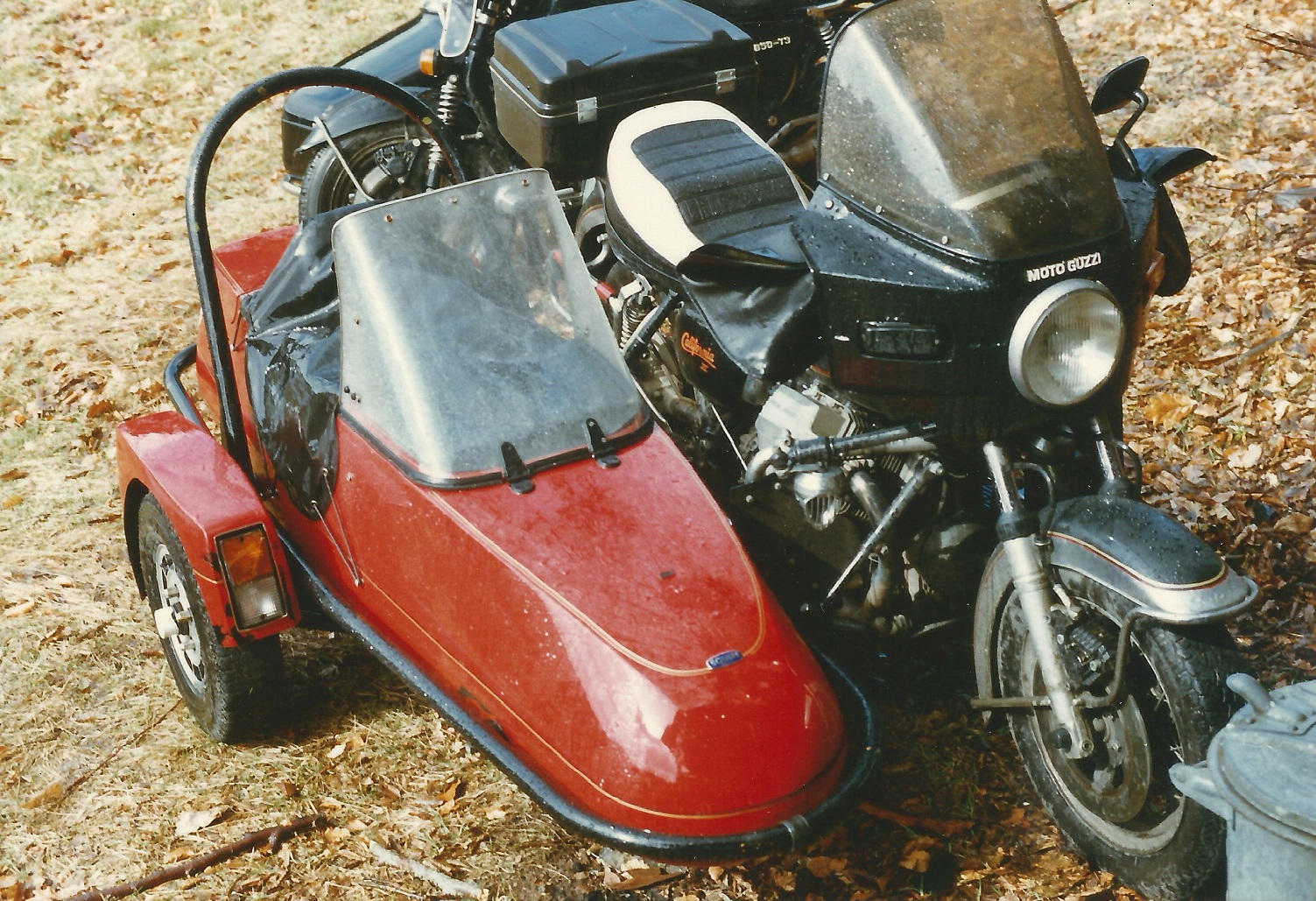 Mein Guzzi-Gespann, Ausbaustufe 1, noch mit Seriengabel, und Serienfederbeinen. Die Verkleidung ist von einer T3 -- man beachte die Handprotektoren --- wurde zur Fahrt zum Elefantentreffen angebaut und haben ihren Zweck mehr als erfüllt (warme Hände bei -15°).