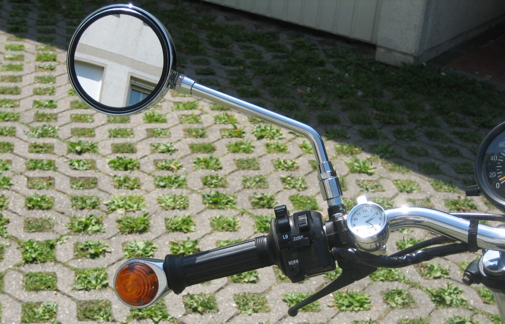 Und nachdem es mir bei den letzten Touren permanent die Spiegel aus der ursprünglichen Lage wegvibriert hat, gibt es auch da eine neue Lösung. Kawa-Spiegel in "einfach und rund", und dazu Vibrationskiller mit dem Yamaha-typischen Rechts-Links-Gewinde. Ich finde sie sehr passend zur neuen Optik. Die alten Spiegel waren filigraner, aber was nutzt die Optik, wenn es im praktischen Alltag nicht funktioniert. Komm also gut klar mit den neuen Spiegeln. Gleich auch noch die Uhr neu positioniert....paßt! Nächste Tour kann kommen, ick freu mir! :mrgreen:
