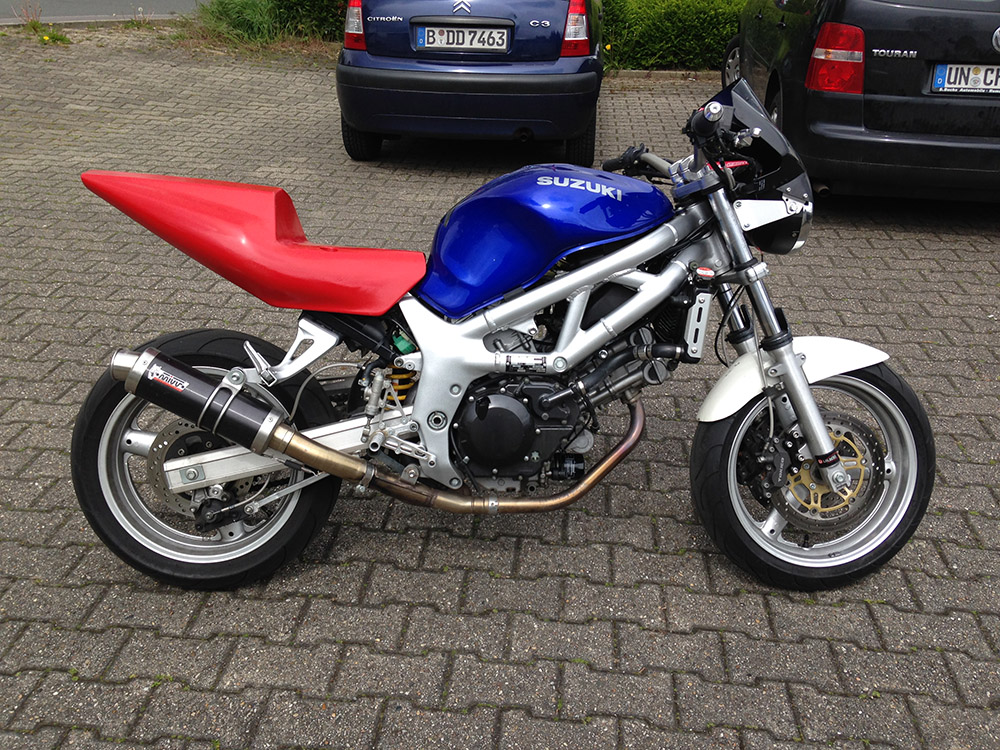 Eines Vorweg: Mehr geht immer! Wenn man möchte, kann man auch Millionen in die kleine SV investieren und hat nachher eine 750er mit 100kg und vergoldetem Rahmen sammt Vergaserinnenbeleuchtung. Das war aber natürlich nicht mein Ziel. Viel mehr ging und geht es mir darum, den besten Mittelweg zwischen Investition und Verbesserung zu finden. Ich habe mich beim Umbau immer gefragt, welcher € wohin fließen soll, um das Gesamtpaket möglichst effektiv zu verbessern. Wie gesagt, mehr geht immer, aber so langsam komme ich an den Punkt, an dem ich mir sagen muss, dass die weiteren möglichen Veränderungen nicht mehr viel verbessern würden, sondern eher weiter individualisieren. Grundsätzlich soll es aber auch noch eine Knubbel bleiben. Auch optisch. Nur eben mit Detailverbesserungen. Ich wollte ein Bike haben, wie ich es mir gerne von Suzuki selbst gewünscht hätte.