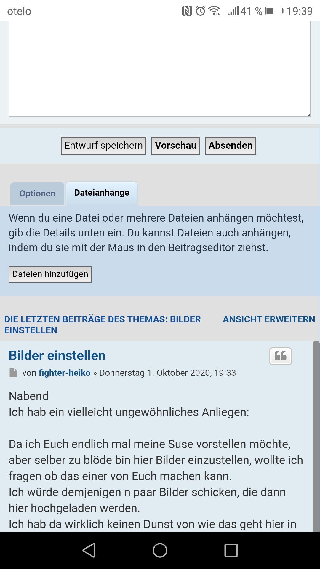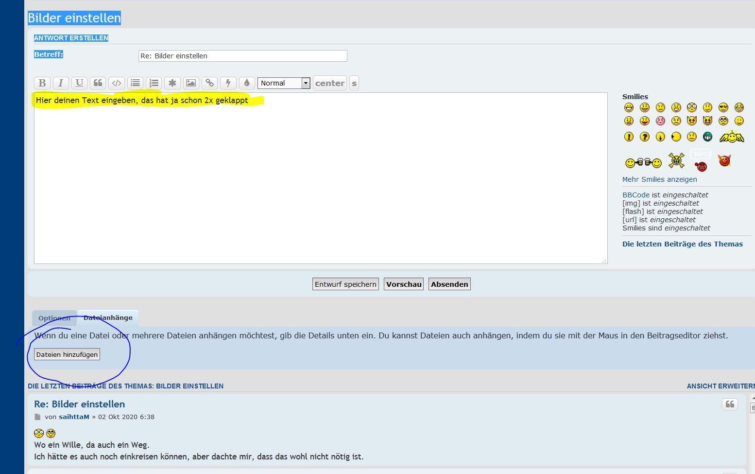 Jedenfalls wenn die Bilder angehängt sind, musst du den Knopf "im Beitrag anzeigen" drücken, dann erscheint im Text noch eine (oder mehrere) Zeilen, dann werden die Bilder in der Antwort angezeigt.