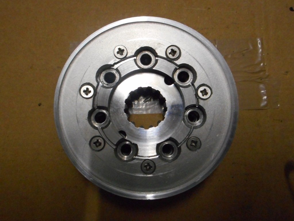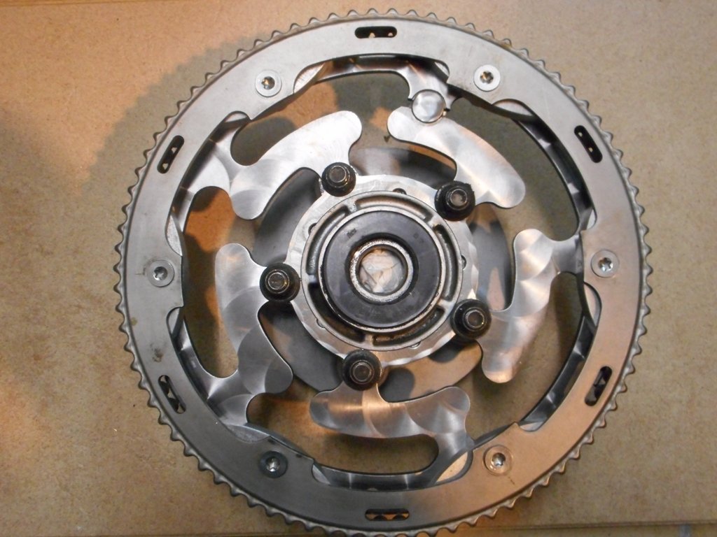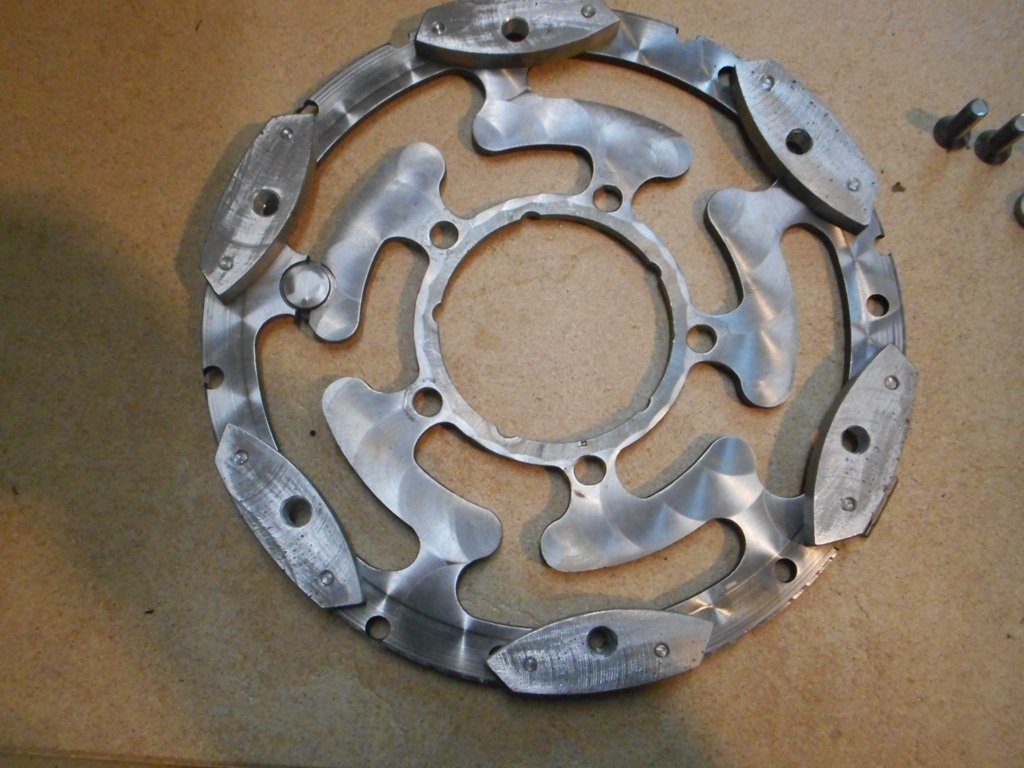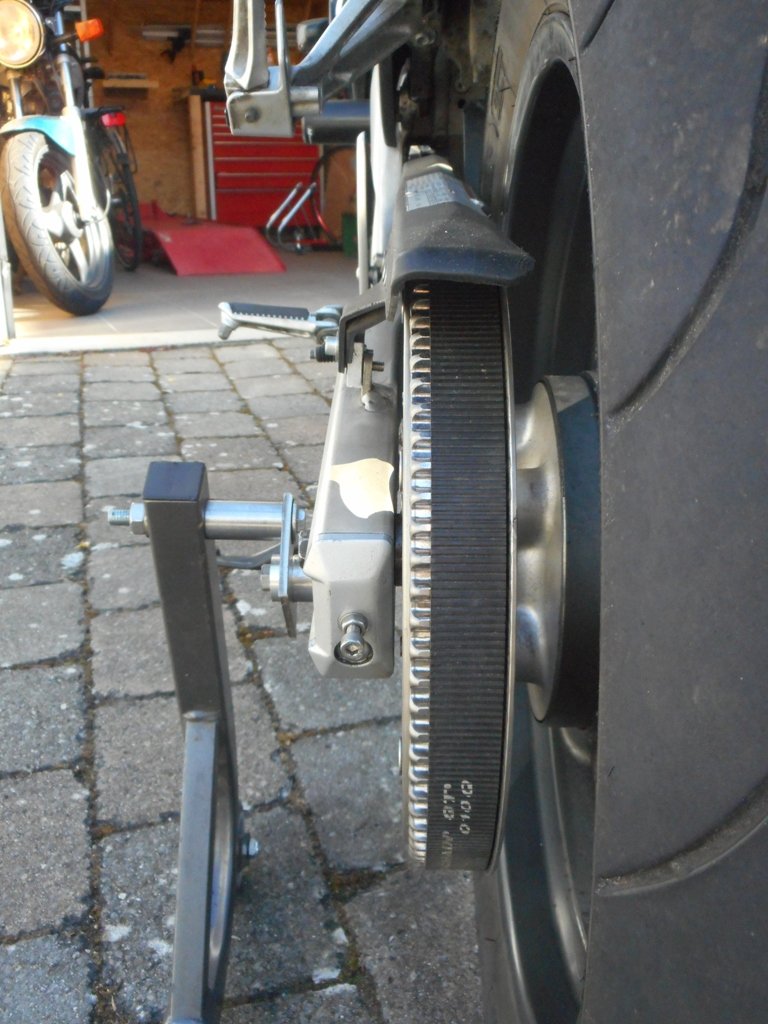 Für den Fall dass es mir nicht behagen sollte, wollte ich aber nicht so viel Geld ausgeben, weshalb ich anstelle eines lasergeschnittenen Aluminiumadapter für die Riemenscheibe hinten, eine alte Harley-Bremsscheibe eines Freundes genommen habe. Den notwendigen Abstand sollten Segmentstücke aus Aluminium herstellen, die ich mit der Bremsscheibe verschraubt habe.